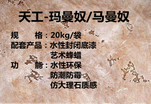 天工瑪曼奴藝術(shù)涂料是具備仿大理石效果的天然石灰基涂料,產(chǎn)品含有大理石顆粒,不同工藝效果可以折射出不同的裝飾風(fēng)格。天工藝術(shù)涂料廠家專業(yè)從事藝術(shù)涂料施工,材料銷售,全國范圍不限地域,全國服務(wù)熱線:136-0768-6784(微信同號),歡迎詢價(jià),采購可免費(fèi)獲取技術(shù)支持。